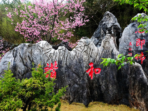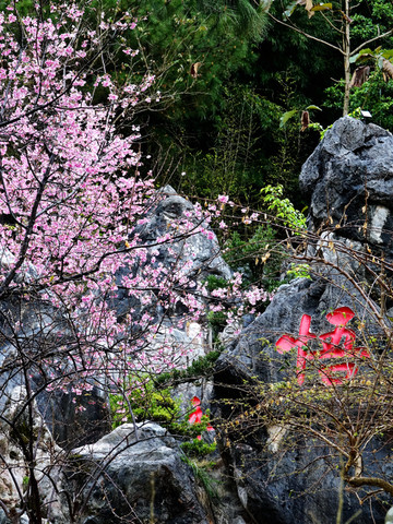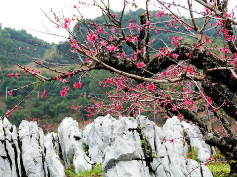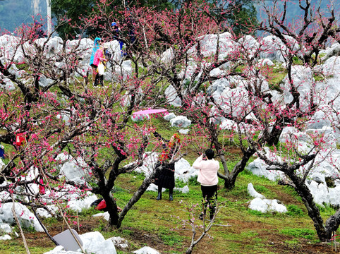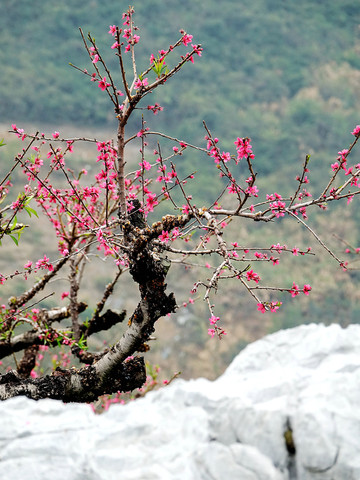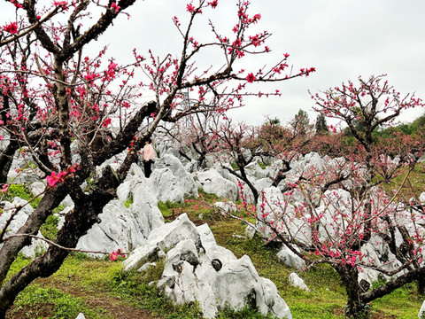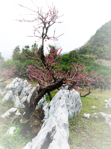 这是一片布满了奇形怪状白石头的山坡,一棵棵桃花树就长在这些石头中,不知道是先有白石头还是先有桃树?