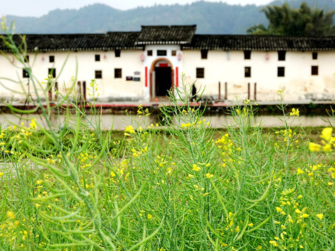 不远处有一片油菜花,成了我们拍摄人物与围屋合影的前景。