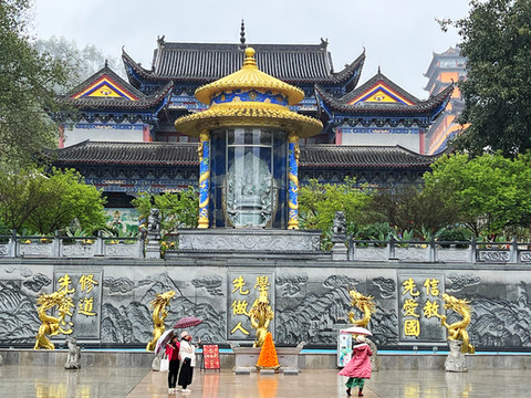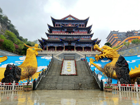 在龙凤祈福广场上的“龙凤盛世”设计,左凤右龙金光闪闪,盘踞在广场两侧,寓意龙凤吉祥,盛世中华。广场上方是正觉堂。