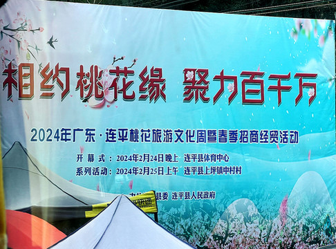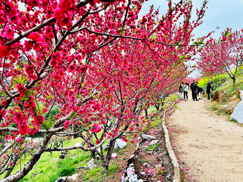午餐后的拍摄热身,把大家的拍摄热情都调动起来了。当我们的车开到 连平 镇中村村双兴 桃园 ——2024年 连平 桃花旅游文化周活动地点,道路被堵塞的丝毫不能动弹,来看花旅行的人和车还不少。下车步行到双兴 桃园 大门。这片桃林在道路一侧的山坡上,正花开浪漫,一棵棵一片片的桃花争相斗艳。