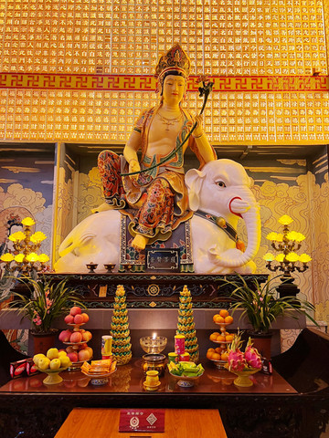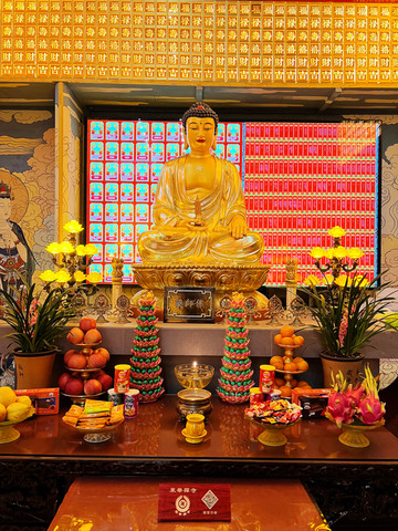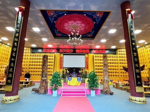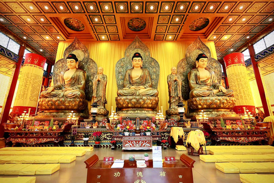 金碧辉煌的大雄宝殿什么时候都是寺庙最重要的殿堂,殿内供奉的释迦摩尼、阿弥陀佛、药师佛,似乎比在其它寺庙见到的更加年轻可亲。两侧墙壁上则布满整部《六组坛经》金色经文。