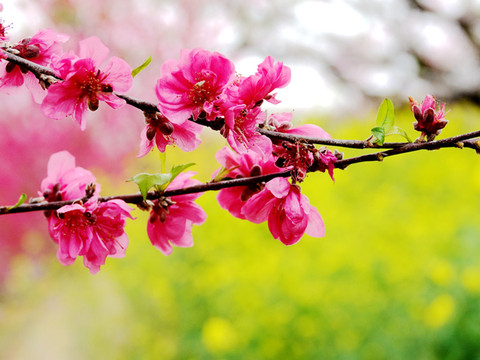 当桃花遇上油菜花,桃花绽放在枝头,粉红色的花瓣如同玉石一般,绽放的桃花香味撩人;油菜花则绽放在大地上,金黄色的花朵像一片片小阳光,洋溢着欢乐的气息。