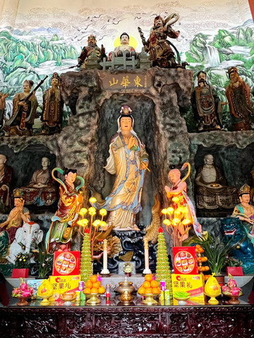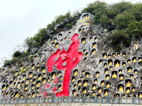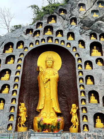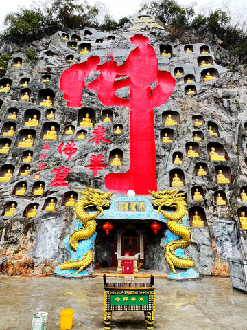 站在正觉堂最高处可以俯瞰全貌。右侧是正在兴建的万福楼、文博馆,左侧是东华佛窟,三百多尊大大小 小金 色佛像端坐于石窟中,慈眼观众生。佛窟中间鲜红的大字“佛”,让佛无处不在!“佛”字高达26米,据说字中有画,但我当时没看出来。“佛”字下方有个洞——三圣洞,据说 印度 智药三藏法师、六祖惠能都曾在此闭关修行。