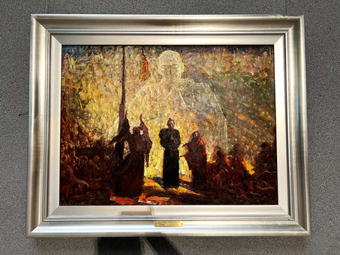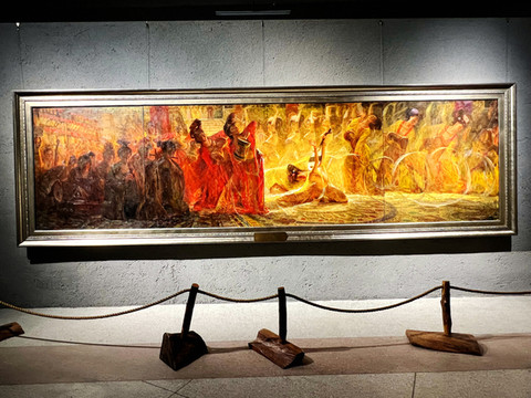 走进美术馆大厅,一幅令人视觉冲击的巨型油画立刻吸引了我们的眼球。这幅名为《脸孔.幡•心动》的油画,长10米,高6米。此画表现慧能被传授袈裟并历练十五年后,在光孝寺巧遇两和尚在争论风吹幡方是“幡动”还是“风动”,慧能顿悟“既不是幡动也不是风动,而是仁者心动”的故事。