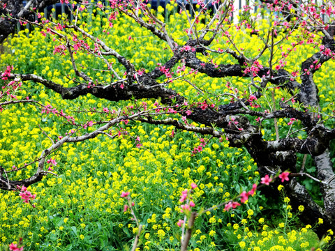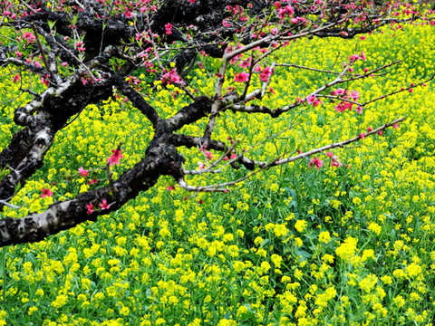 靠近山脚下的桃树下种满了油菜花,油菜花黄绿色背景,映衬得桃花更加美丽夺目。