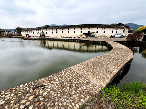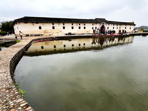 长安围是南方客家围楼的一个缩影,围楼正前方有一口半圆形的池塘,池塘水清澈,风起微波粼粼。客家人的水为财说,祠前有水,预兆族人能聚拢八方财富。同时池塘水也可用作消防用水。
