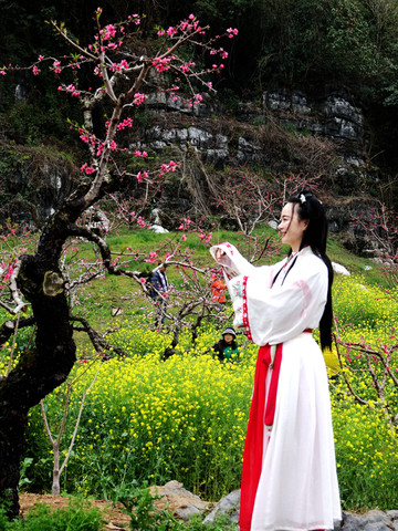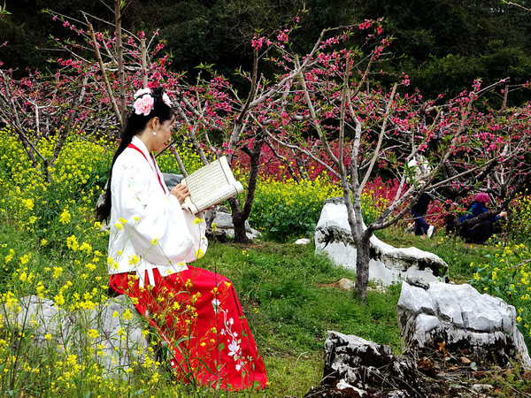 见到穿汉服的女子,蹭拍是少不了的。古代服装为桃花增色不少。