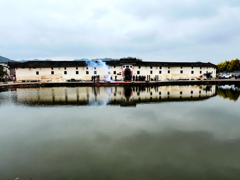 正遇上一群人在围屋前祭祖,也许是这座围屋的后人,燃起了炮仗噼里啪啦,屡屡浓烟直冲云霄。围屋前的这个池塘,是拍摄围屋倒影的好地方。