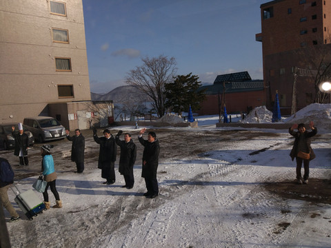 早上10点的班车回札幌,大巴开动的时候,酒店的工作人员站在空地上向我们挥手。