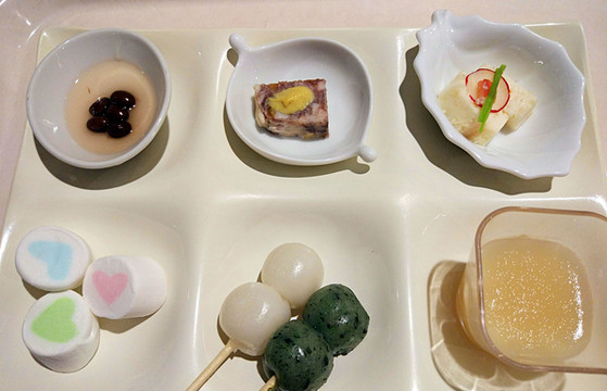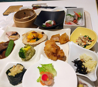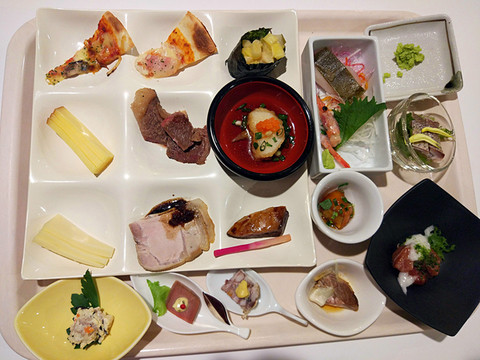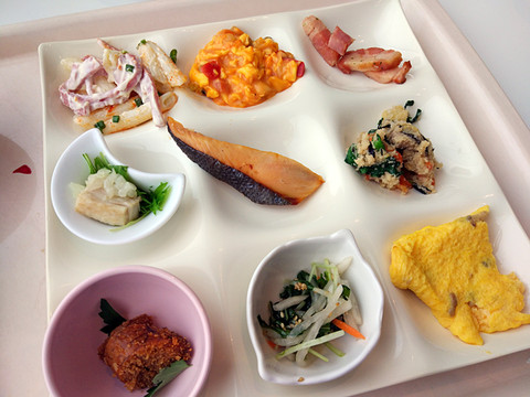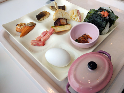 早晚用餐都在自助餐厅,餐厅的一整面落地窗也理所当然地面朝湖景,高度是房间里的两倍,视野更加开阔,妥妥的秀色可餐。餐品独具霓虹特色,餐具小巧玲珑,摆盘雅趣精致,不知不觉就消灭掉好几个九宫格。