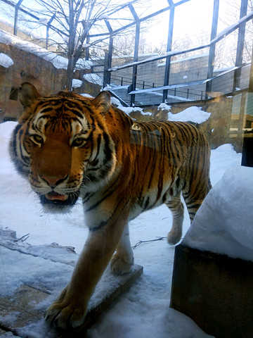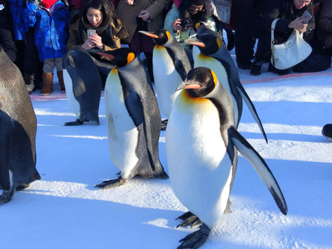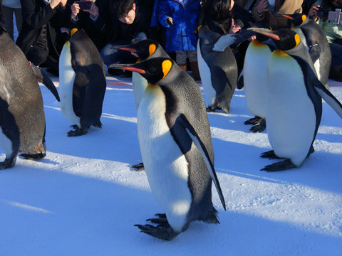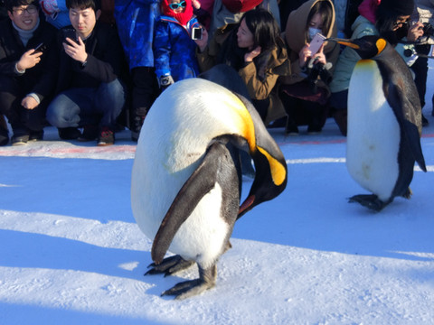 旭山动物园的明星项目就是企鹅散步了。散步时间通常是上午11点和下午2点30分两次,工作人员会事先在企鹅散步路线的两侧拉起安全线,以确保企鹅散步时一路畅通。通常散步时间之前的半小时左右,游客就会蜂拥而至,以便抢占有利地形,方便拍照。时间一到,闸门一开,企鹅就出来撒欢儿了: