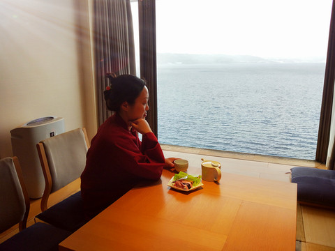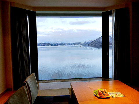 我们的酒店位于面向湖畔的绝佳位置,被洞爷湖的绝美景色所包围。所有客房都是湖景房,大片大片的落地窗把洞爷湖的美景框住,足不出户就能欣赏开阔明丽的湖景。虽然入住的时候已近黄昏,打开房门的那一刹那风光却美到令人窒息。