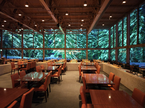 晚餐必须安排在森林自助餐厅NININUPURI,那可是拍出胡霍大片的美颜餐厅啊。整个餐厅被百年树龄的虾夷松林包围,顶天立地的玻璃帷幕把整片森林投映在目之所及之处,无论白昼还是夜晚都能带来绿与白的视觉飨宴。赏心悦目、心旷神怡,不愧是男神青睐之地。