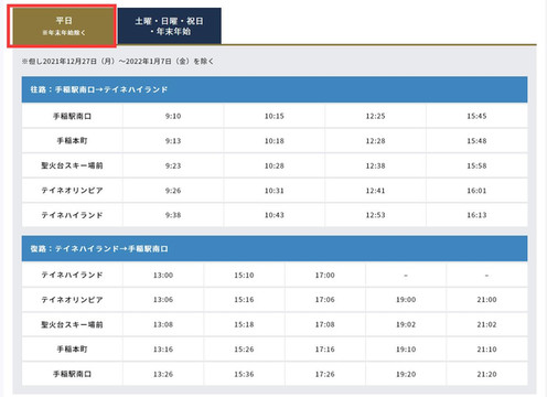 巴士运行时刻表分平日与周末,周末的班次会加密。一下截图是21/22雪季的巴士时刻表。