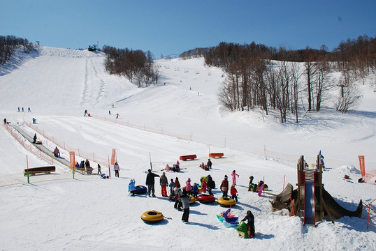 一处带有防风罩的儿童冰雪乐园,备有传送带(魔毯),上上下下不费力,方便儿童亲近滑雪。滑雪乐园分三大区域:雪橇游玩区、雪圈游玩区和单板&双板区。