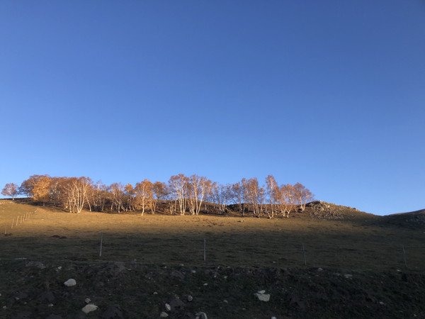 盘上山顶,来到一个三岔路口,往右是去阿斯哈图石林,往左赫然写着热阿线,啊啊啊,这就是传说中的热阿线,我们毫不犹豫地左拐进入热阿线。做过攻略的人应该都知道热阿线的盛名。热阿线位于内蒙古赤峰市克什克腾旗境内,起点是热水塘镇,终点是阿斯哈图石林景区。阿斯哈图石林我们几年前去过,门票价格不菲,而我们此行基本达成一致不去收费的景点,所以就放弃了。一进入热阿线,美景扑面而来,在热阿线上,你可以真切地感受到风景在路上的真言。前行不久就到了乌布拉格驿站,驿站里的地图显示,内蒙古已经把热阿线、达达线加上通往乌兰布统的经乌线都打包起来规划成中国北疆风景大道,名字很有气势,而沿途的景色也绝对是配得上这样的气势。在热阿线上,随处可见白桦林、草原、山丘,我们的汽车时而在山巅远眺四野,时而蜿蜒进五彩森林,时而俯冲到广阔平原,天色已晚,我们没有停歇,就这样悠然自然地穿行在秋日的热阿线上。