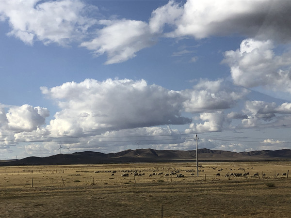 汤足饭饱之后,我们看地图发现沽源有一条很长的南北走向的闪电河,沿河有一条牧闪线,大家觉得这个路名不错,走走小路说不定有风景可以写写生,于是取道牧闪线,前往正蓝旗。不过说实话,牧闪线沿途风景其实一般,也看不见闪电河。进入内蒙境内之后,沿途开始有较大片的草原,草原上牛羊在悠闲地吃草,蓝天上白云如层层白浪向远处铺开,是草原特有的景象。但是大部分牧场都有铁丝网围着,也不方便停车写生。