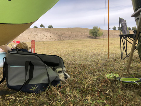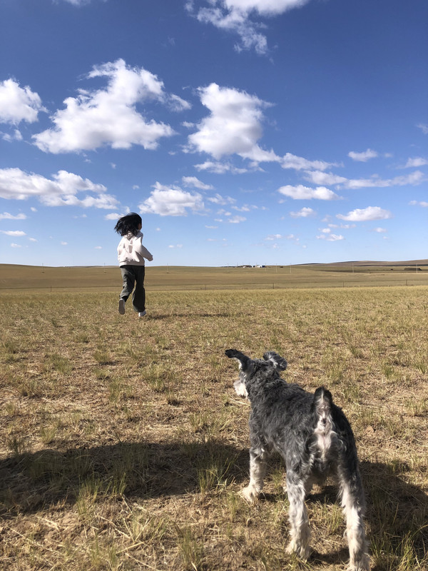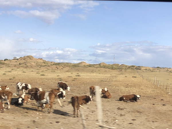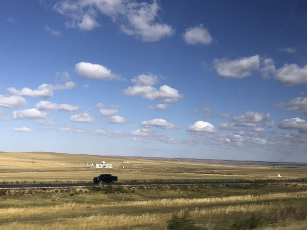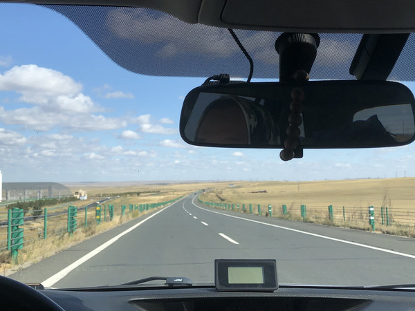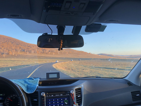 因为今天的行程比较长,所以没有在锡林浩特久留。上午在市区加了油,就直奔G207西乌珠穆沁旗方向。尽管是国庆假期,但是G207上车很少,路的双向用绿化带隔离,恍惚间以为是高速公路。G207沿线两侧都是一望无际的大草原。尽管此时的草都已经变黄了,却也别有一番意境。草原基本都被铁丝网围住了,很难停车下来欣赏。好不容易看到一个岔路口,我们果断拐进去,找了一个没有铁丝网的地方停下车。计划中是在草原找个地方泡茶发呆写写生,谁知道草原上风好大,气温也比较凉,根本没法长时间待在户外,所以就是带着猫和狗一起下车拍了拍照片。这里要说明的是,秋天的草原,牧草收割完毕,草地还是挺扎脚的,所以小狗在这里根本不敢撒欢奔跑(后来回家,发现小狗的脚掌里扎了一根木针发炎了),所以在这里最好给小狗穿上防扎的鞋套。