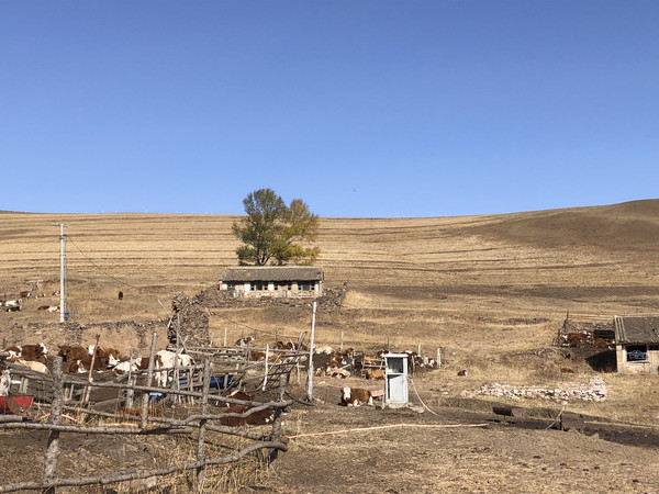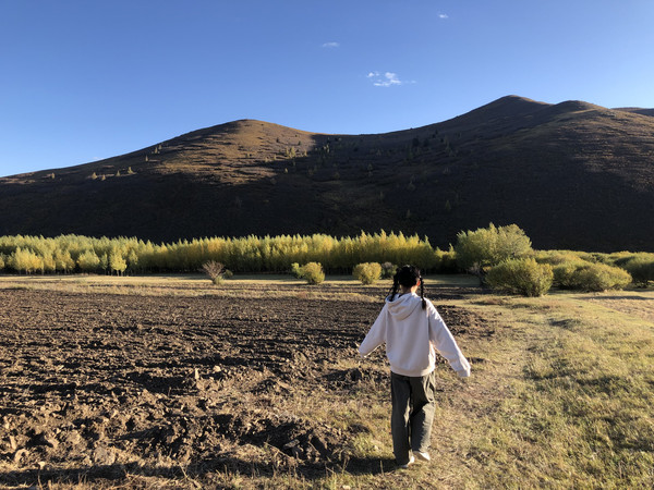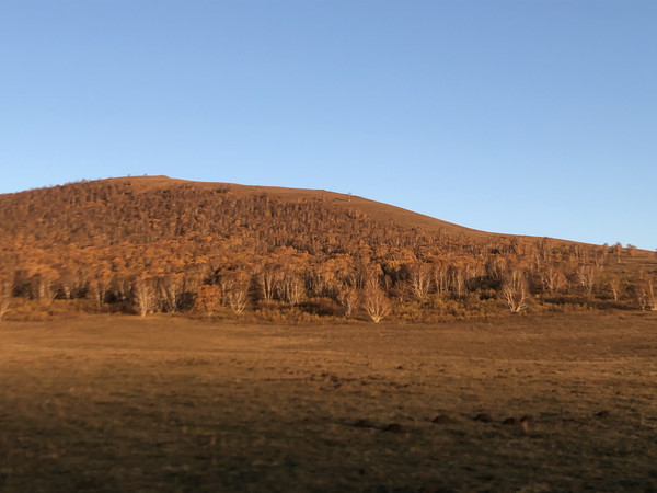 99号公路全长160公里,由于我们要赶往克什克腾旗,所以当行驶到99号公路与G306交叉时,我们就右拐取道G306沿阿斯哈图石林方向行驶。导航的时候,百度给导了一条村路,而正是这条村路也给了我们很多惊喜。如果想走这条道路,在G306上可以百度导航到阿斯哈图石林,然后加一个途经点碧流汰村即可。比起高速公路或者国道,其实我们更喜欢走一些烟火气息更浓郁的小路。这条村路基本是蜿蜒在山谷之中,前半段其实风景一般,路的右边是村庄,左边则是挨着山坡的狭小田地。此时正值秋收,夕阳下的农田风光倒也是令人心旷神怡的。大约开个一小时左右,车过了华鑫宾馆及一片蒙古包宿营地之后,风景突然开始变得很美,夕阳下绚丽的山地秋色,让我的脑海里情不自禁蹦出三个字——小瑞士。路的左侧是狭长的山谷平地,有平整的黄绿色的草地,有收割了的露出黑土的农田,山谷里不时可见成群的牛羊在怡然自得地吃草。紧挨着平地的是不高不矮的山丘,坡上散落着片片金黄的白桦林,夕阳西下,金色的阳光柔柔地倾洒在这山谷里,黄艳艳、金灿灿,禁不住又想在此驻足喝茶发呆画画,于是我们开始沿途寻找农家乐或者民宿,打算住在这里好好享受这宁静的下午。遗憾的是,沿途的民宿很少,好不容易看到一家特别令人心动的途乐山庄,可惜已经订满,后面还有一家刘家大院,也是满房。只好依依不舍告别我心中的小瑞士。过了刘家大院,开始进入大转弯的盘山路,在盘山路上回望我心中的小瑞士,心中依依不舍。