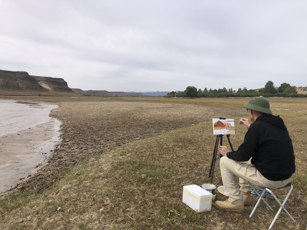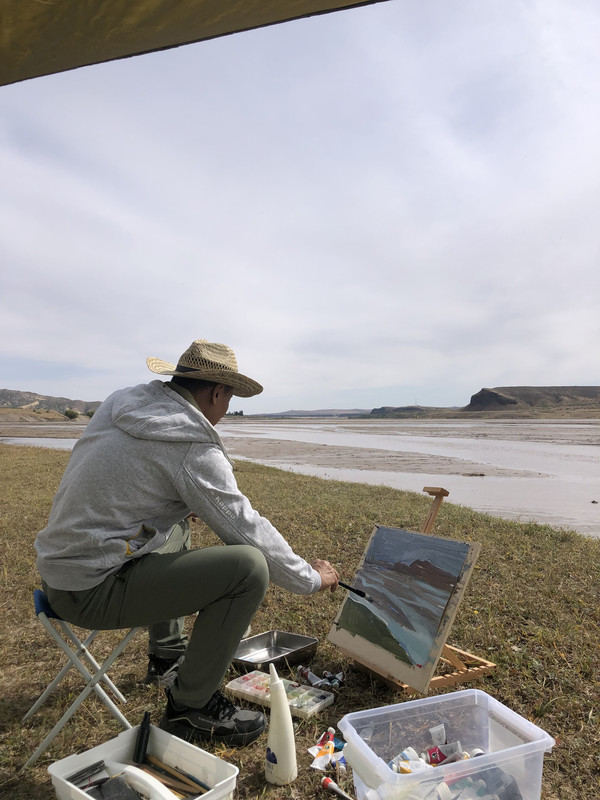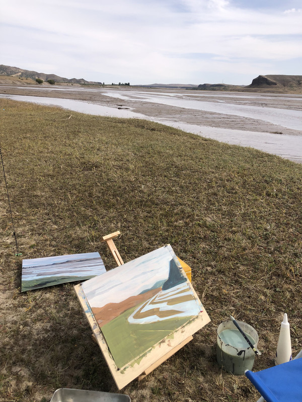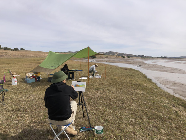河滩上几乎没有风,阳光柔柔的,温度也算是舒适,于是我们很快支起了天幕,摆上了桌椅,画架也终于支上了。就这样,一群人幕天席地在河滩上开始自得其乐:家北和朋友写生,小宝趴在桌上写作业,小丁在包包里睡觉,朋友夫人抱着猫晒太阳,我家老太太去附近捡石头,我则抽空去河滩的沙地挖了个城堡。家北和朋友是大学同学,都是油画专业毕业,现在都分别是大学老师,又一起在同一个画室创作,年轻时的友谊就这样延续了下来。画笔疾飞,河畔美景在他俩的画布上渐次延伸。此时此刻的艺术家是令人羡慕的,纵情挥毫,恣意表达,好不快哉。