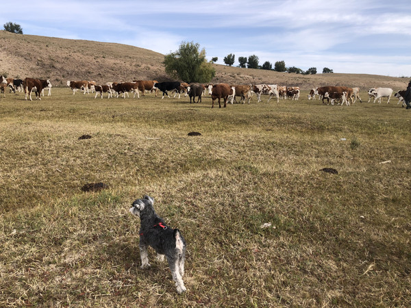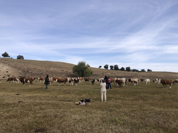 连着两天切身感受美景在路上,可是出发前说好的随时停下来泡茶发呆写生的愿望始终没有实现。茶具、画具,甚至还有渔具都带着呢,不用一用可怎么行?得知我们离西拉沐沦河已经很近了,家北说今天的行程他来规划,要找个河边写生钓鱼去。然后我们就跟着他来到了巴林右旗的西拉沐沦河畔,具体地名也不知道是哪里,但终归是找到了一处只有我们这几个游客的河滩。河滩上长满了草,一个中年牛倌正在放牧,牛群大约有五六十头,蔚为壮观。大家很开心地围观牛群,牛群对人早已见怪不怪,倒是十分好奇地围观地上小小的小丁(我家的雪纳瑞狗),并且不停地想向它发起进攻,哈哈,求小丁的心理阴影面积。