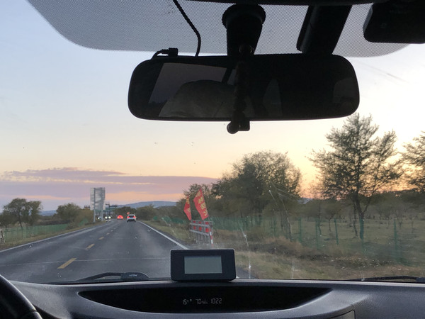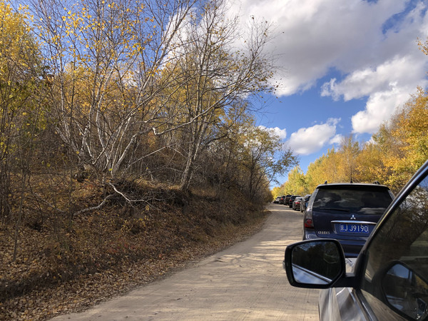 天快黑之前,我们来到了热阿线与黄岗梁铁矿线交叉的十字路口(路口有一个加油站),直走就可以进入黄岗梁国家森林公园。黄岗梁也是秋天来克什克腾旗的小伙伴们必打卡的地方,据说是大兴安岭山脉最高峰,秋意浓郁,景色壮观,而且不收门票。不过此刻我们赶上了热阿线修路封闭不让进,车很快排起了长龙,国庆假期不堵个车好像也说不过去,说着这就堵上了。眼见着天马上黑下来,今晚的住宿又没有着落,正打算右拐进铁矿路绕道去克什克腾旗经棚镇,突然车队松动了,黄岗梁方向居然放行了,说是路刚刚修好了,可以进了,明天正式通车。哇,真是上天眷顾啊。当然,此时天也已经黑下来了,黄岗梁的美景是无缘看见了,只能被裹挟在车龙里摸黑过了山梁。山里也有两三家住宿的地方,但无一不是客满,只能径直奔热水塘镇去。