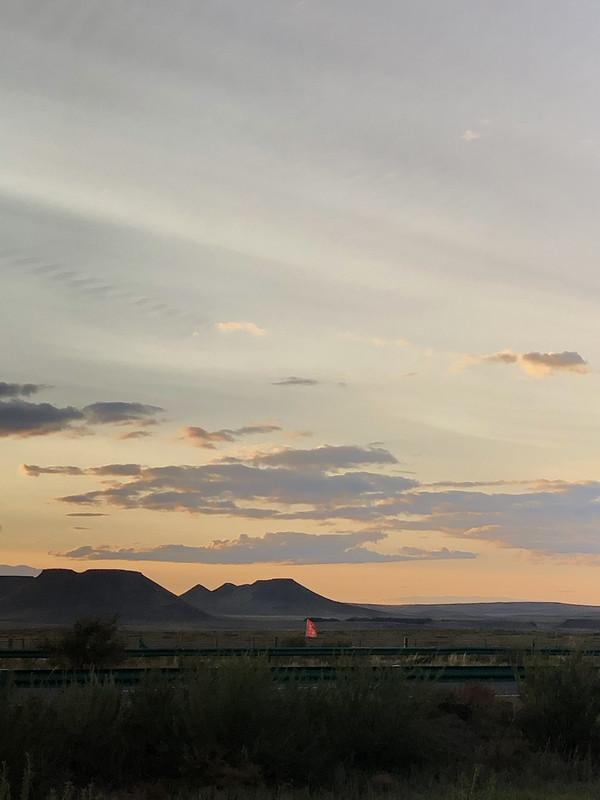 接近锡林浩特时,夕阳西下,天色渐晚,此时路左边的远方突然出现了一片平顶的山丘群,这就是平顶山火山地质公园了。出发前看攻略说可以开车前往,原本计划在傍晚时分驾车观赏或者写生,但是眼看天色马上就要暗下来了,只能放弃。所幸路边有个观景台,我们停车远眺了一下夕阳下草原火山的壮美景观,觉得也不错了,待日后有机会再去吧。