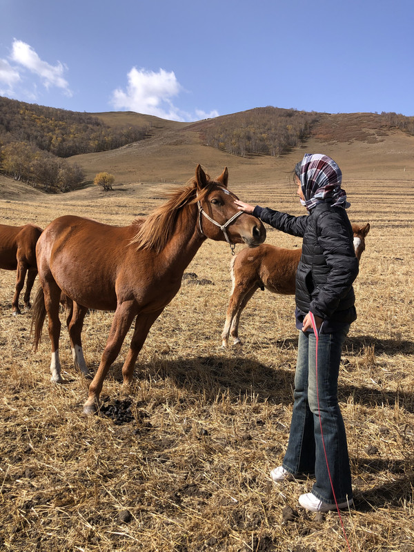 行程的最后一天了,离北京也就300公里了,所以大家反倒觉得很放松。我们选择了达人比较推荐的半虎线回京。从鱼儿山镇向南行进至国家一号风景大道终点,然后朝左拐进入省道S244往北京怀柔方向开就是半虎线。半虎线基本是一条蜿蜒在山谷中的小路,全程路况都挺好,前几公里,路两边会有很多骑马场。其中有一个骑马场挺大,关键是骑马场有条小路可以直通后面的小村庄,小村庄被牧场环绕,牧场上有马群在安静地吃草,不远处是山丘,狭长的山沟里长着一片金黄的白桦林。汽车顺着这条小土路可以一气儿开到白桦林那里,沿途还可以近距离看马儿吃草,在这里,我们逗留了有半个小时左右,大人小孩都感觉很开心。本来打算在这里骑骑马,但是那天风真的是太大了,大家只好打消念头。