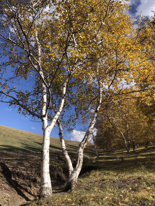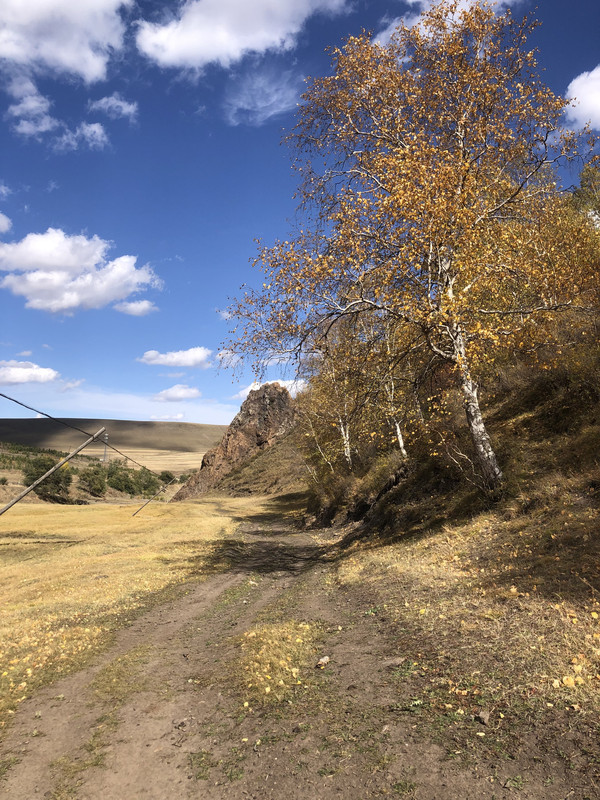 继续沿着经乌线前行,心里有些忐忑,因为昨晚看攻略说经乌线也在修路,并且就在昨晚一大批车辆深夜堵在经乌线上,险象环生,所以也不知今天是否可以顺利通过。路上经过一个加油站,看着不是很靠谱,但是昨晚的攻略说有些车堵在那里最后没有油很惨,所以我们的原则是只要油箱过半,看到加油站就抓紧加油。过了这个加油站,风景开始变得美丽起来。蓝天、白云、山谷、白桦林等不断映入眼帘。车拐过一个大弯之后,一幅炫丽的秋之山谷图猝不及防地展现在我们面前。路边刚好有一个停车场地,趁着午后的阳光,我们直接跳进了画里。