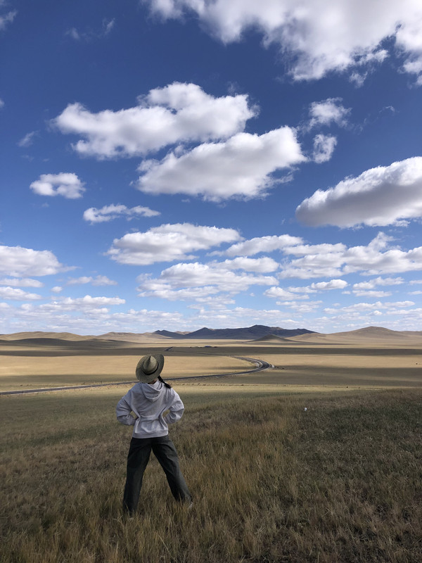拍完照,继续前行。草原的风景往往都是一开始看见会惊叫,大约一个小时后就容易审美疲劳了。司机同志开了快两个小时后说,要是还是看这些风景,那他就想回家了~所幸,就在这时,路的右侧出现了99号公路的大Logo,大家精神为之一振。99号公路属于西乌珠穆沁旗,黑色的柏油路面上绘着蓝色、粉色和黄色的分隔线,视觉效果活泼浪漫,所以也称为草原深处的彩虹路。这个路口紧挨着巴拉嘎尔高勒西收费站,是99号公路的最西端。拐进99号公路,路两边依旧是草原,但这里的草原景观品质骤然升级,绝对是电脑桌面即视感。在路边的一个小山坡边上,不少人都停下车爬到山头赏景。站在山坡,举目远眺,草原从山脚绵延至天边的山丘,蓝蓝的天上飘着朵朵蓬松的白云,阳光透过云缝投射在草原和山丘上,晦明变化,亦真亦幻,置身其中,只觉岁月静好,红尘无忧。之前也是见过呼伦贝尔大草原的,但是这样的草原美景真的属于此生必看,只有亲临其境,才能感受个中美好。这时又想如果能在这里泡茶发呆写生,真是无比享受,但是依然是风很大,没有办法久留,非常遗憾。
