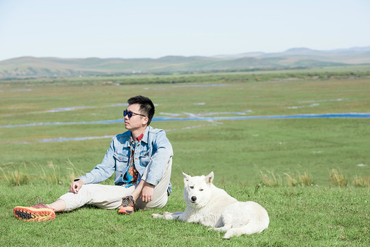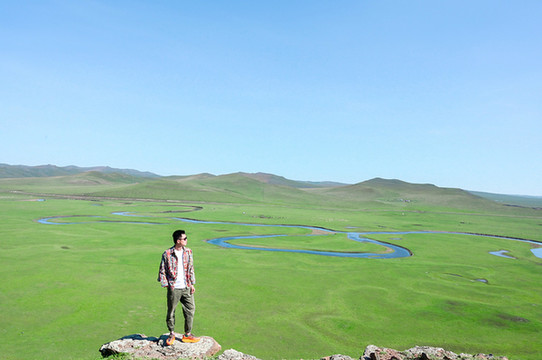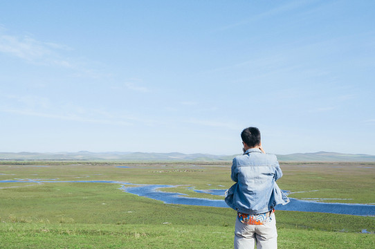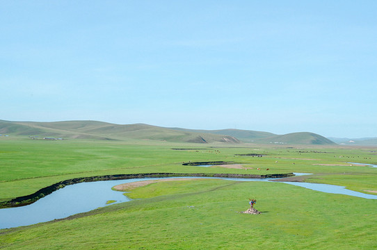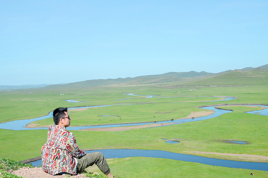 坐在一个小山包上,草原河流尽收眼底。河流蜿蜒而下,牛羊马群四处奔走。在大自然面前,人类真的太渺小了,恰恰又是人类才能领略这大自然的美景。
