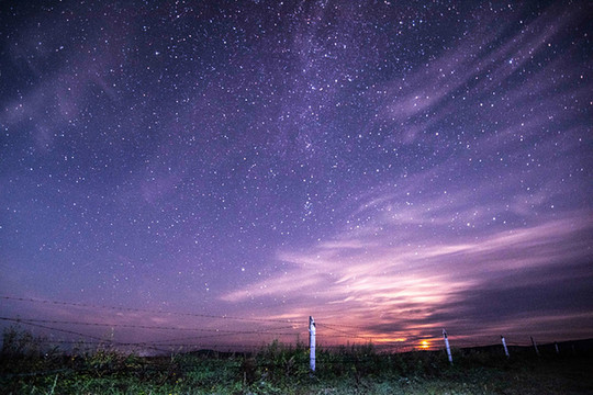 天上星罗棋布,地上绿草如茵。星空下的草地与满天繁星相得益彰。星空就像是一块纱,大大小小,星罗棋布的镶嵌着钻石,这纱又撒上了钻石粉末,然后铺在天空上。地上的花草树木在宁静的星空下窃窃私语,铁桩牵起了手拉手牵起了线,守护着说悄悄话的草木们,防止他们的秘密被人们偷听了去。