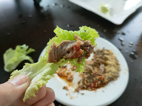 还没下火车,背包先生就跟我说:“待会下车带你去吃烤肉!”作为一个半素食主义者,对于吃肉是丝毫提不起兴趣的!但是!!!自从吃了齐齐哈尔的烤肉,瞬间打开了我吃肉的“新世纪”大门!绝了!怎么会有这么好吃的烤肉!不是吹!我这么瘦小的女孩子一顿真能吃完一斤的烤肉!这也忒爽了吧!!!这家餐厅买肉需要自行到旁边的商店购买,牛肉49一斤,会帮忙拌好料,称好后会送上几块牛油,最后烤前自己在铁板上抹上一层牛油,滋啦滋啦哇塞,那香味那口感就是不一样!