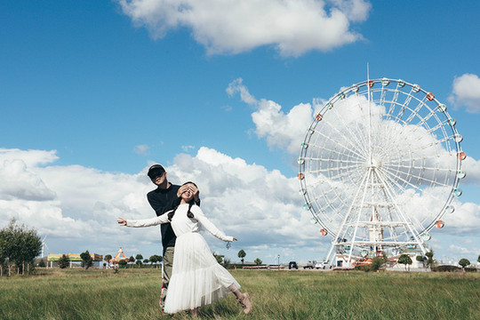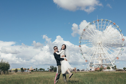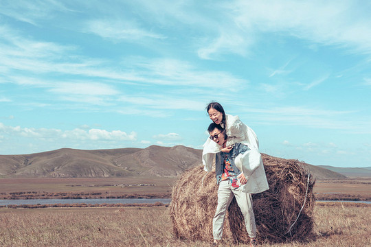 如果说找回童年是自己曾经的纯真,那么要是和最爱的人一起相拥,那一定会是草原下最浪漫的回忆~天地见证,草原、白云、微风、暖阳一起来贺