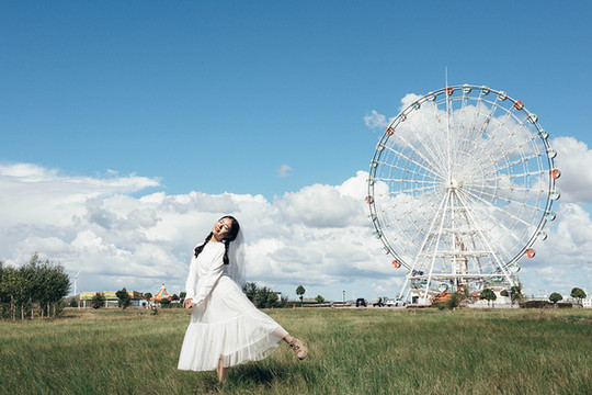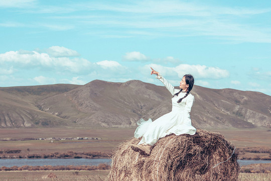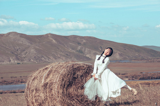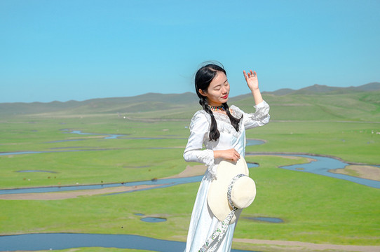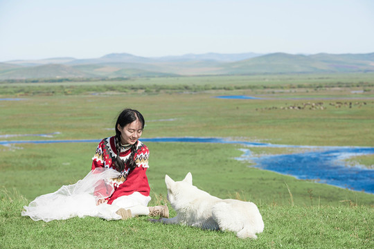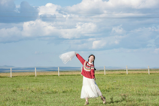 穿起一身民族服装,迎风而立。身后蔚蓝的天空,广阔的草原,蜿蜒的河流,奔走的羊群,以及头顶洒下的金色阳光,此刻都和这位漂亮的姑娘融在了一起。