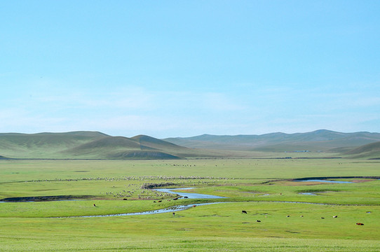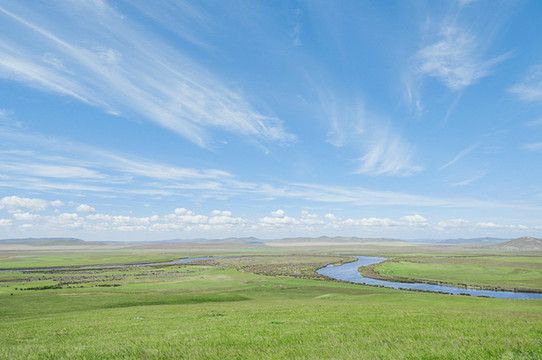 河水蜿蜒而下,平缓安静。好像水就没有动过,河水是草原的根基,为草原提供了水源,水草丰美,牛羊成群。水占了非常大的作用。河水不仅为碧绿的草原提供了水,还未草原儿女脸上带去了幸福的笑容。