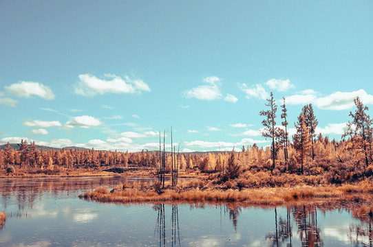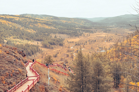 ——阿尔山国家森林公园: 一眼望去,层林尽染。树与树的枝丫交叉着,顺着山脉形成了波浪。金黄色的阳光打在了金黄色的森林公园里。公园里动物正在低头细嚼慢咽今天的食物,已经接近黄昏,马上就要回到窝棚,它们就好像傍晚从地里回家的农夫一样,再看看今天的成果。