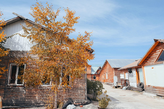 一阵秋风扫过,发黄的树叶还是眷恋着枝丫舍不得走。灰白色尖顶小屋在和煦的阳光下,与白色树干金黄树叶组成一幅明亮的画。看画的人走进画中,也就成了画的一部分了。