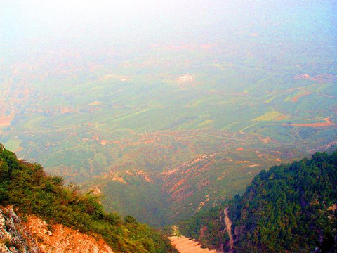 进入绵山山门后开始进入蜿蜒曲折的盘山公路。沿途景观秀美异常。驱车在山间向下望去,也是一片云雾缭绕。透过雾色是朦胧中的广阔的绿色田野。
