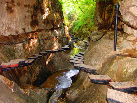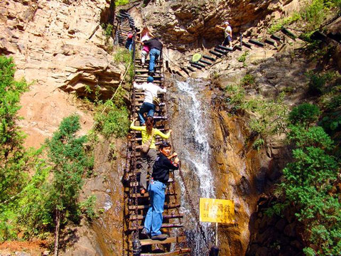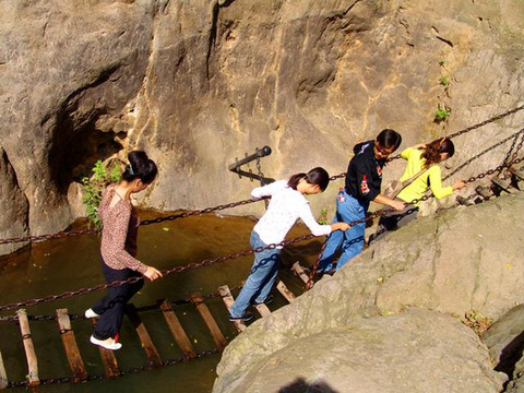 登山的过程绝对是一次对心理承受力的挑战。有时在陡峭的天梯上爬,身体不由自主地随梯摆动不说,还要尽享从天而降的飞瀑溅起的水花。有的吊桥低处处于溪水中。如果你不愿意打湿鞋子,就得躬腰曲身慢步行走在嵌在岩壁上的铁板上。如果注意力不集中就会有掉下去的风险。当然真掉下去也不会太大的危险,但却要落入潺潺流淌的溪水中。“玩的就是心跳”,恐怕用在这里是名副其实的。