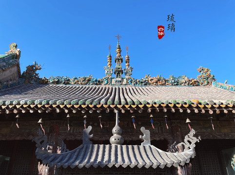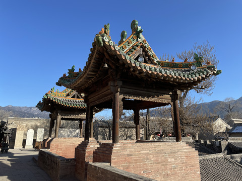空王行祠重修于明万历41年(公元1613年),距今已有四百余年。大殿坐北向南,殿内塑有空王佛像,山墙绘有空王佛成佛的故事壁画。殿顶的明代三彩琉璃装饰,刀工细腻,烧制精致,形象逼真,栩栩如生。另外,在空王佛行宫的前廊下有两尊罕见的琉璃碑,东侧的石碑记述了空王佛修炼成佛的艰苦历程,西侧的石碑记载空王佛行宫修建的经过。