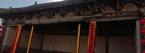 稷益庙位于阳王镇的一小村落里面,这一天是年初六,庙前戏台用金色的布包起来,墙上贴有百福。非常有喜庆气氛!小庙外表很普通,但里面却是让我们意外惊喜!