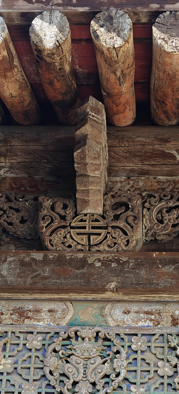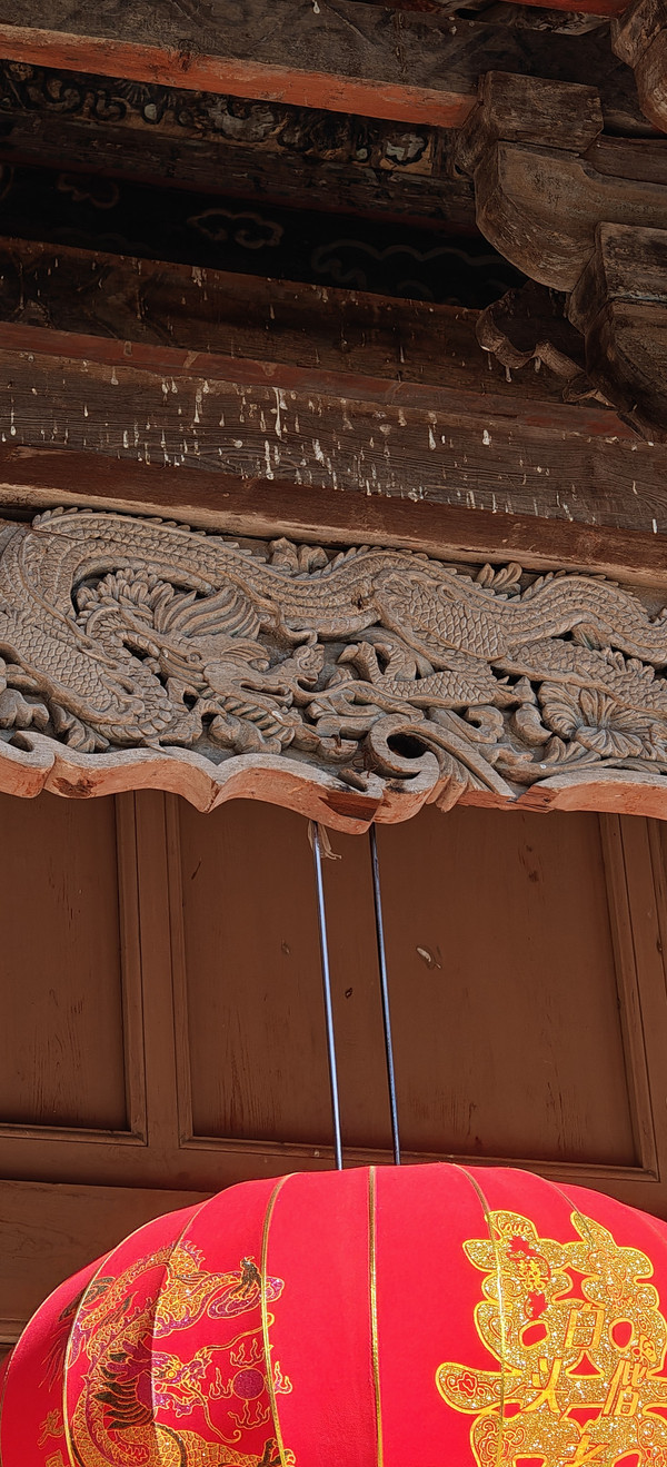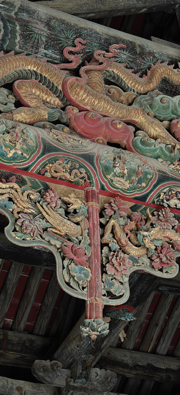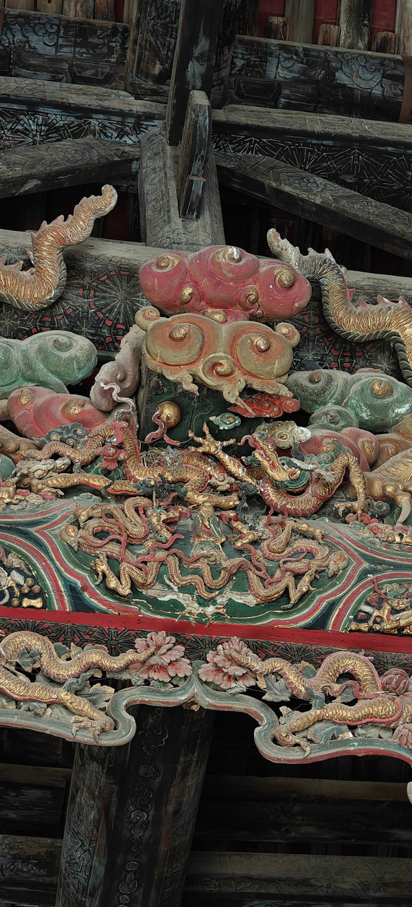 稷益庙除了精美的壁画外,它梁上悬塑也是一大看点,两条金光闪闪的五爪金龙,分列两边;