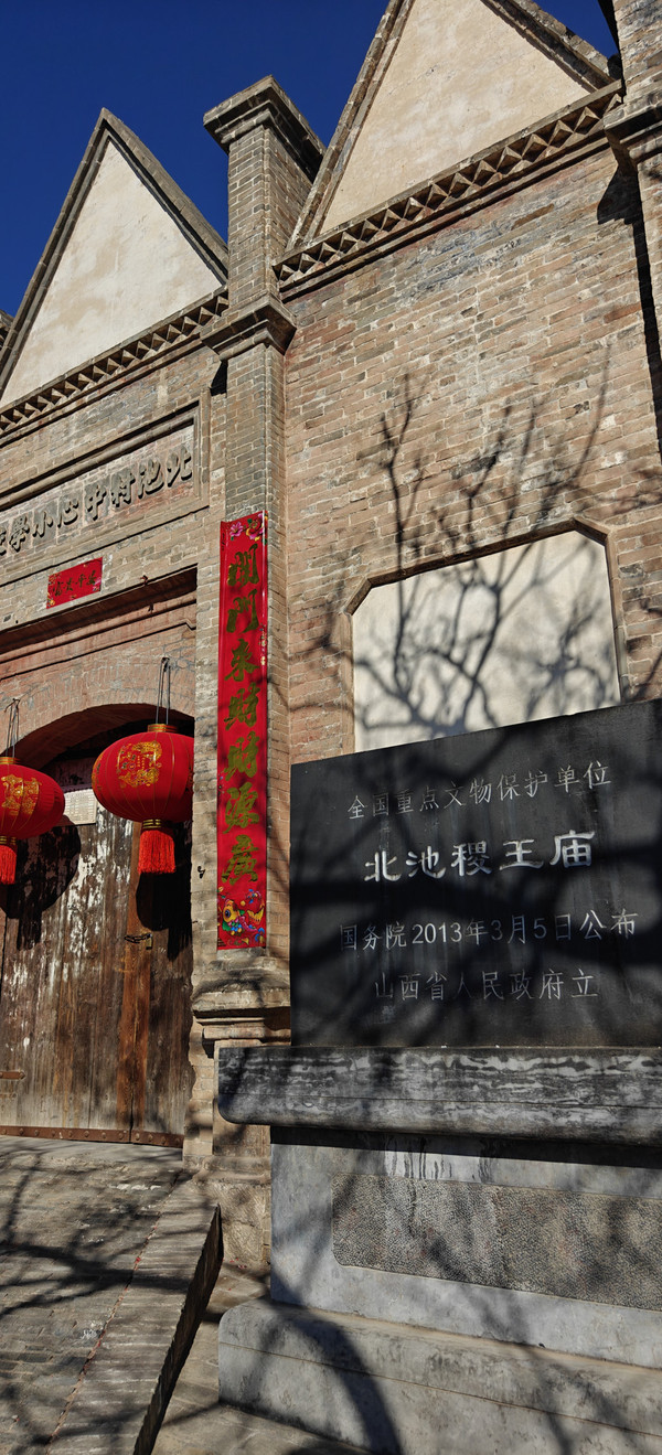 离开了稷益庙前,晒太阳的几位老人家听说我们是广东来了,不免跟我们唠叨了几句,并提议我们去一趟北池的稷王庙。本着来都来了,不管怎样也要到此一游的心态,我们又赶往北池,到了后打了文保员的电话,进去后有点失望,庙是刚修复完,里面没有多少东西,唯一有看头的是主殿对面的戏台和西侧配殿的木雕,特别是木雕,非常精美!
