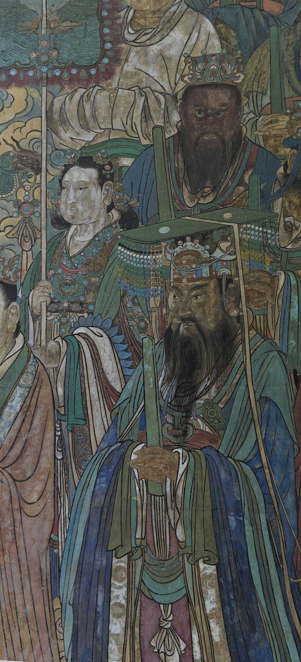 上面的照片来自临摹室,在大殿内是不准拍照的,我们在参观的时候,恰好殿外的阳光透过窗楞洒了进来,阴暗的大殿,立时明亮起来,墙上壁画也清晰很多,一众仙人仿佛拨开了云雾,现身于四周,他们衣带飘逸,神态各异,或肃穆或低语;有捧五彩珊瑚,有托八宝莲花,满身珠光宝气,一派雍容华贵;仔细聆听,仙乐飘飘之音,仿佛时有或无。殿内参观的众人,此时正屏气凝神观赏着,导游也只是低声的介绍,这一刻或者也怕惊动天上的神仙了!此时我才明白昨天小刘司机说阴天观感不好的道理。