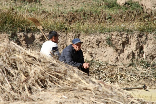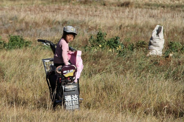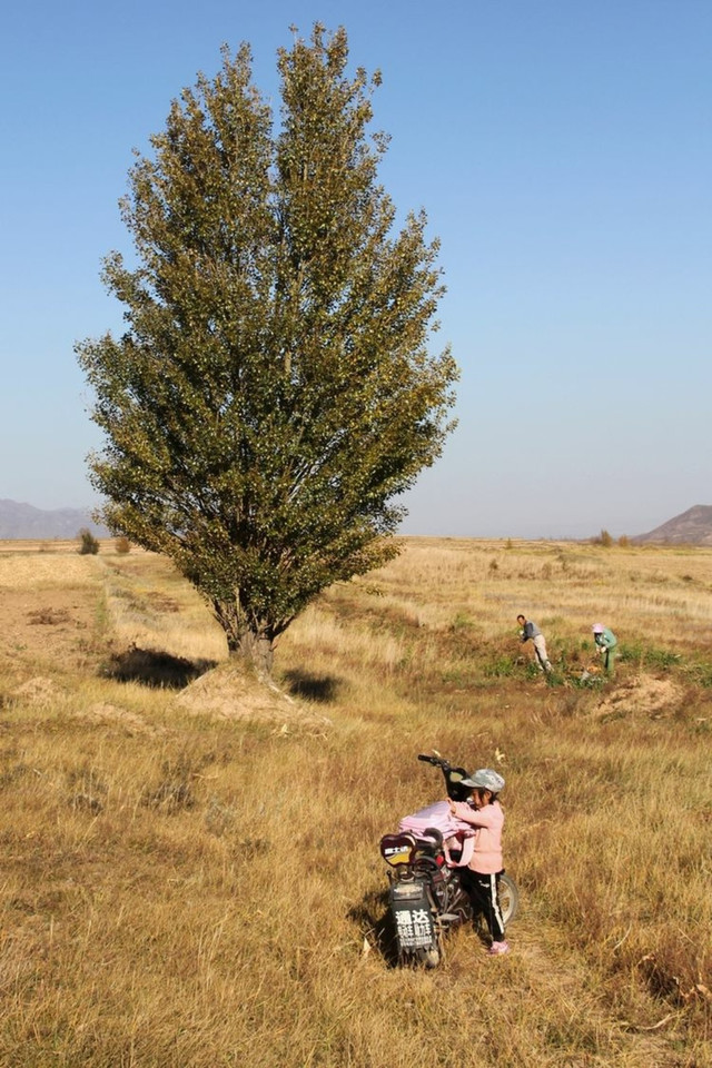二是长城之里,大片荒芜的草滩上有一小片的土豆地,两位老者刨的刨捡的捡,一个小女孩儿在电动车的车座上写字。大概她实在太小了,帮不上大人的忙,只能做作业。可能是女孩儿发现了我,很警惕。凝视我片刻,女孩儿跑向那两位老者,他们该是爷爷奶奶或者姥爷姥姥。我惊了小女孩儿,有些不好意思,跟两位老人打个招呼便走了。