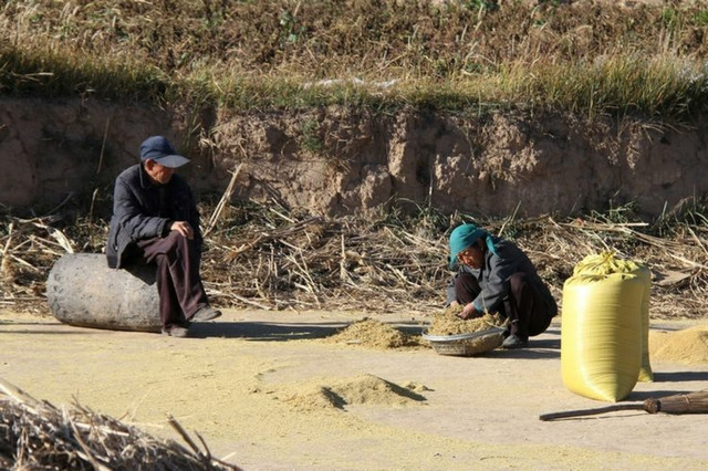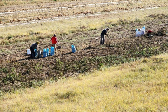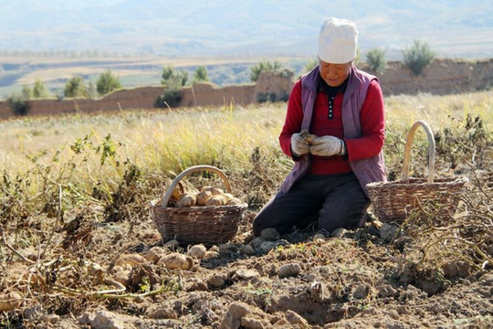 那刨土豆的老汉像姐夫呢,一脸黝黑的,只是默默地。那捡土豆的大姐,却是跪着的,泥土里抠出来擦净,放进篮子里,满了倒进袋子里,再跪下,往前爬。“想吃,就带上点儿吧,不要钱!”
