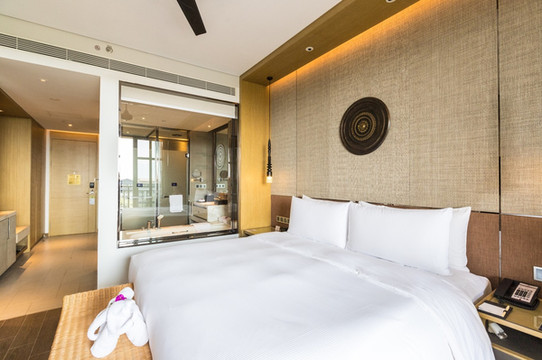 半开放式的浴室,通过移门和卧室区分开来,却紧密相连,无形中扩大了整个房间的面积,民俗风景图案、中式挑灯、藤编的床靠让客房更有度假的感觉。从假日到皇冠品牌的升级,除了硬件上的改造,细节装饰、备品以及各种logo已经悄然全部更换,仿佛从一开始就是为皇冠设定。