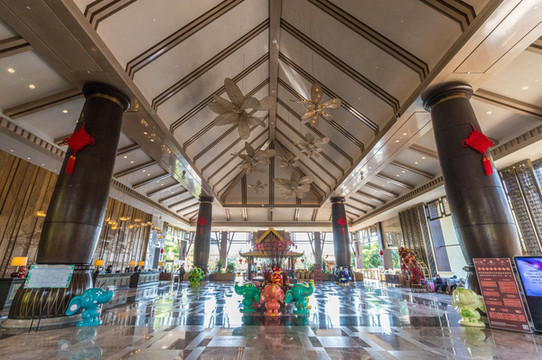 万达度假区的这三家酒店傣族风格元素取得各不相同,逸林的雨林感更为强烈,酒店大堂最吸引眼球当属中庭的吊灯,以景洪市的市花鸡蛋花造型,营造出一片灵动轻盈感;而大堂柱子的造型选用象脚鼓的造型,象脚鼓舞亦是版纳独有的非物质文化遗产。