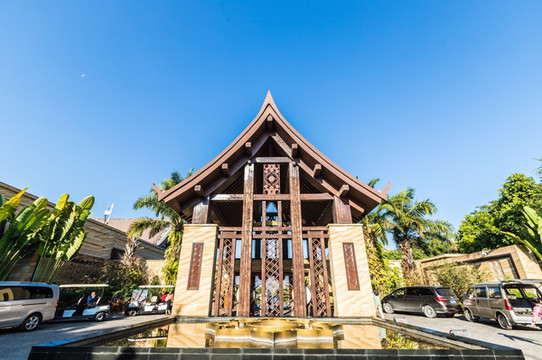 傣族文化,100个西双版纳的酒店就有100种解读,万达文华入户用吊脚楼造型的回廊,莲花的火盆盛开在水池中,少数民族的热情在佛教禅意中点燃,是酒店对傣族水文化、佛教文化重要解读,平台水景中的睡莲,倒影下的建筑和不远处大金塔无不是向当地南传佛教的致敬。酒店所有的建筑顶部都沿用当地房屋特点,斜顶,弯曲的飞檐直指蓝天。